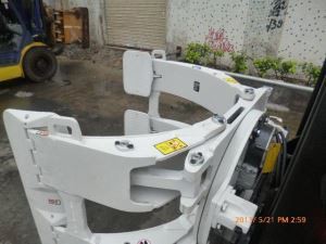 Objemka je priključek za viličar, ki vključuje okvir, roko, povezano z okvirjem, in valj, povezan z roko. Držalna roka vključuje levo in desno roko. En konec valja je pritrjen na levi krak, drugi konec valja pa je pritrjen na desni krak. Leva in desna roka se odpirata in zapirata z oljnim cilindrom. Vsaj ena prva omejevalna luknja je razporejena na levi strani zgibne točke na prvem konektorju, drugi konektor pa je opremljen z vsaj eno prvo omejevalno luknjo na desni strani zgibne točke. Prva omejevalna luknja je vstavljena s prvo omejevalno komponento za omejevanje kota zapiranja leve in desne roke, ki tako omeji najmanjši vpenjalni kot objemke in prepreči trčenje leve in desne roke. V držalni objemki je prva mejna luknja, ki lahko omeji zapiralni kot leve in desne roke, tako da omeji najmanjši vpenjalni kot objemke in prepreči trčenje leve in desne roke. Potem lahko vpne manjše predmete. Struktura je preprosta, enostavna za uporabo in zelo praktična.