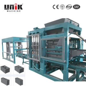 Avtomatski stroj za cementno opeko je v glavnem sestavljen iz devetih delov: sklopa okvirja, sklopa tlačne glave, sklopa za vibracije, napajalnega vozička, sklopa lijaka, podajalnika plošč, izhodnega stroja za opeko, hidravličnega sistema in krmilnega sistema. Med delom so mešani materiali shranjeni v lijaku, materiali, potrebni za različne opeke, pa se s časovno kontrolo prenesejo na dovodni voziček, dovodna škatla pa se pošlje na vrh kalupa skozi oljni valj za dovajanje, tlačna glava pa se pritisne navzdol in hkrati se začne vibracijska hitra izdelava prototipov. Podajalnik plošč potisne oblikovane opeke na ploščad za izgradnjo opeke in celoten proizvodni proces samodejno nadzoruje nadzorni sistem. Imamo različne velikosti strojev za izdelavo blokov, ki izpolnjujejo različne zahteve. Če potrebujete podrobne informacije, nas kontaktirajte na sales@unikmachinery.com.